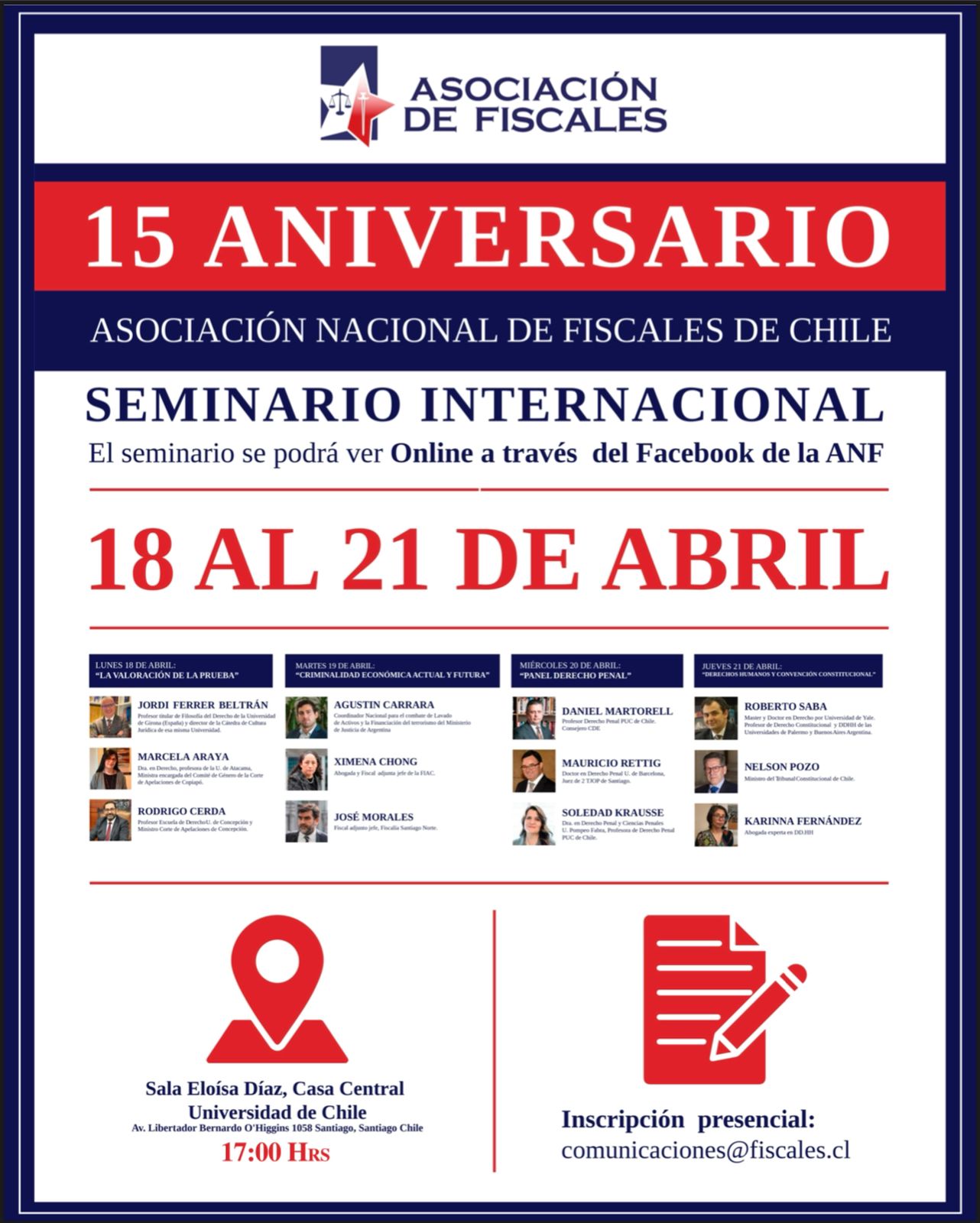 Cada día del evento, a partir de las 17:00 horas, los interesados podrán asistir a la casa Central de la Universidad de Chile (inscripciones en comunicaciones@fiscales.cl) y quienes prefieran participar on line, podrán hacerlo a través del Facebook de la ANF.